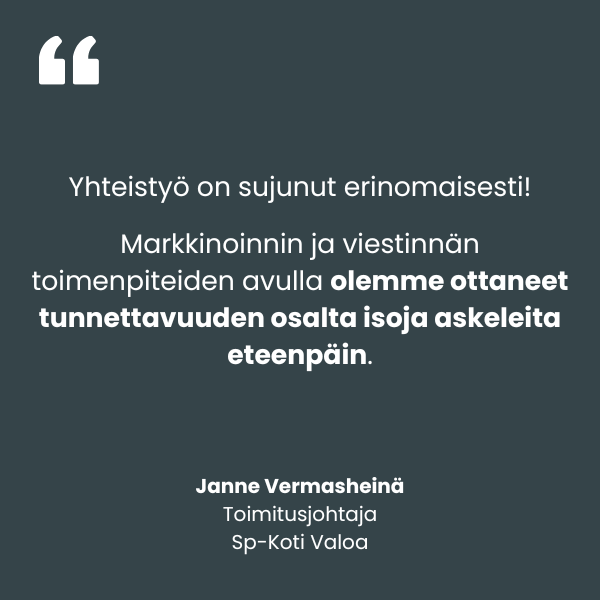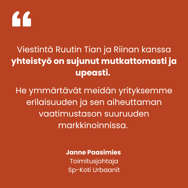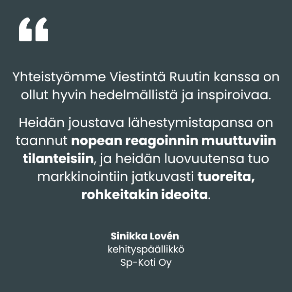 Yhteistyö Sp-Kodin kanssa alkoi vuonna 2021, kun uudistimme Sp-Koti Urbaanien markkinointistrategian ja aloitimme sosiaalisen median sisältömarkkinoinnin tuottamisen entistä urbaanimmalla otteella. Nyt kumppanuus on laajentunut valtakunnallisen Sp-Koti-ketjun sekä ketjuun kuuluvien välitysliikkeiden jatkuvan markkinoinnin yhteistyöhön sekä projektiluontoisten kokonaisuuksien toteutukseen.