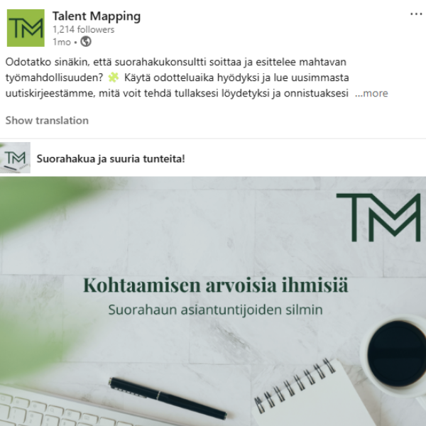 Talent Mappingin LinkedIn-sisältöjen kulmakiviä ovat uutiskirje sekä laadukas asiantuntijaviestintä. Sisällöissä käsitellään työelämän ja henkilöstöresursoinnin ajankohtaisia teemoja sekä tarjotaan tuoreita näkökulmia niin rekrytoijalle kuin rekrytoitaville.